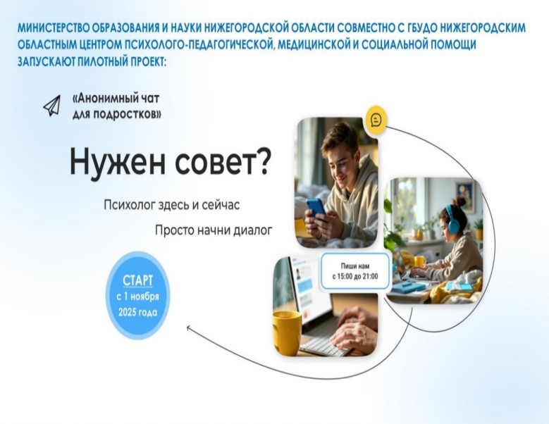1 ноября 2025 года министерство образования и науки Нижегородской области совместно с Нижегородским областным центром психолого-педагогической, медицинской и социальной помощи запустили проект «Анонимный чат для подростков «Мы с тобой онлайн».