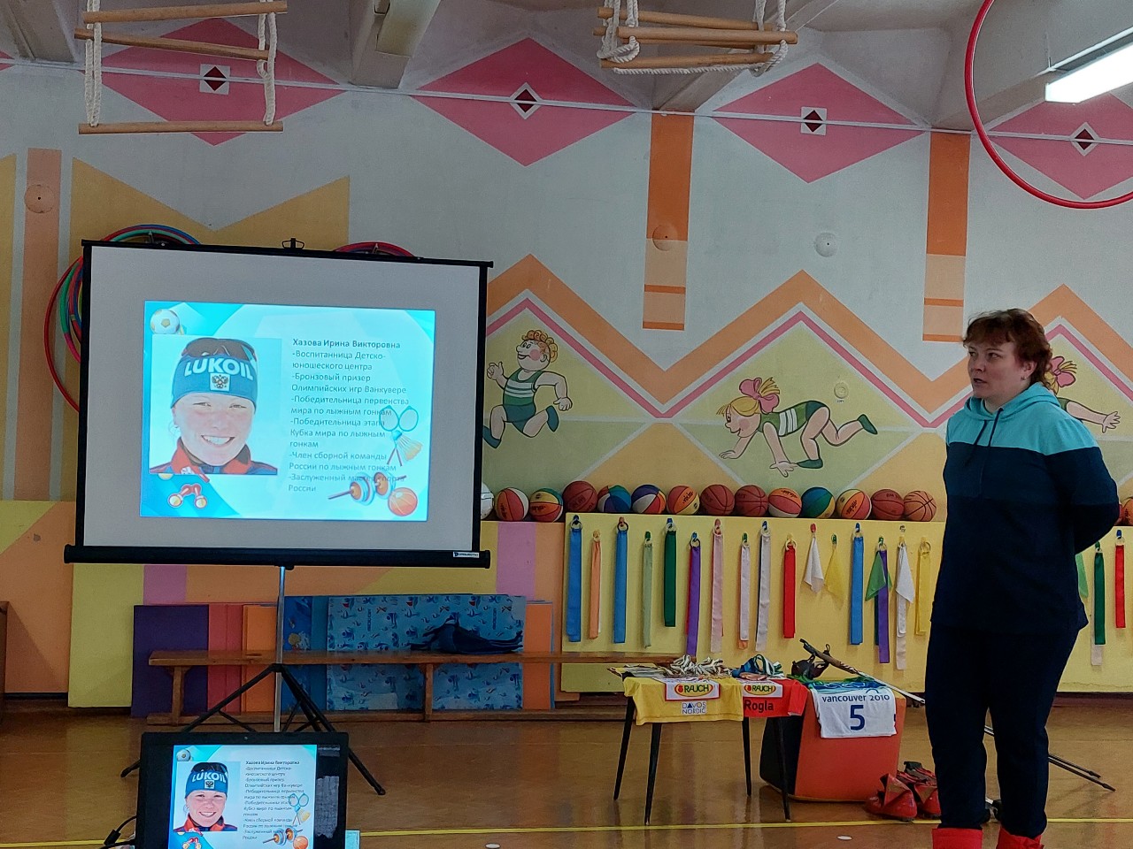 18 февраля воспитанники старшей группы № 7 встретились с Олимпийской чемпионкой Хазовой Ириной Викторовной. Хазова Ирина Викторовна бронзовый призер Олимпийских игр в Ванкувере, победительница первенства мира по лыжным гонкам, победительница Кубка мира по лыжным гонкам. Она рассказала о своем любимом виде спорта, достижениях и наградах. Дети узнали, что в детстве она очень любила кататься на лыжах, для занятий которыми нужны хорошее дыхание и выносливость. А чтобы всё это было, необходимо соблюдать режим дня, правильно питаться, делать утреннюю гимнастику, не пропускать тренировки, выполнять указания тренера. После ребята с удовольствием рассмотрели и примерили медали спортсменки.